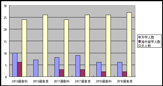 食品系本科专业专业多来就业率一直在学校居于前列,近三年来,就业率一直为100%,近三年食品科学与食品质量与安全(中文)毕业的153名内地毕业生中,46人攻读硕士研究生,升学率30%,其中16位到美国、澳大利亚、爱尔兰及香港等海外名校留学深造,占总毕业生10.5%,就业的毕业生中,92%在珠三角相关企业就业,为大湾区经济提供了优秀的工程和管理人才。食品质量与安全(全英授课)专业升学深造率在60%以上。
